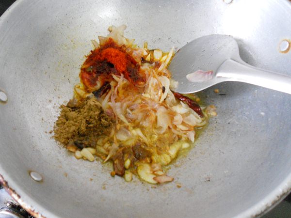 - Once the onion starts to brown, add in the Kashmiri chilli powder, coriander powder, turmeric powder, mix well.