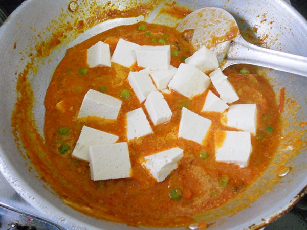 - Add about 3/4 cup water. Cover the pan and simmer for 3 minutes so that the peas gets cooked. Open the pan and add in the tofu and let it simmer so that the flavors seep in.